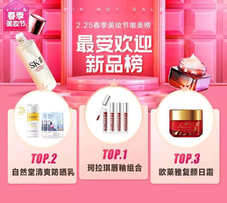 借由春季煥新,美妝、國(guó)貨美妝均在美妝節(jié)期間上線新品,唯品會(huì)已成為“后”、Olay等的全網(wǎng)新品陣地。從受歡迎度看,珂拉琪迷你空氣唇釉口紅、自然堂清爽運(yùn)動(dòng)防曬乳、歐萊雅復(fù)顏視黃醇位列三甲。