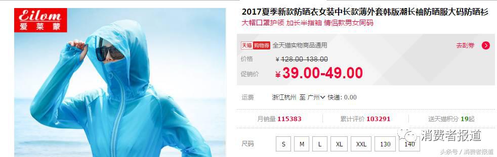 調(diào)(ji)皮(zhi)的消道長(zhǎng)還選擇了一款淘寶(月銷11萬(wàn)件)、但售價(jià)僅為39元的愛(ài)萊蒙2017夏季新款防曬衣加入測(cè)試。