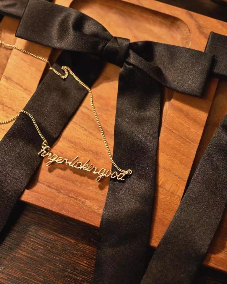 吮指原味雞的標(biāo)語(yǔ)“it’s finger lickin’good ” 變身成了項(xiàng)鏈,和肯德基爺爺?shù)暮谏I(lǐng)結(jié)組成個(gè)情侶飾品