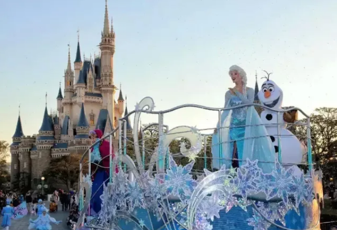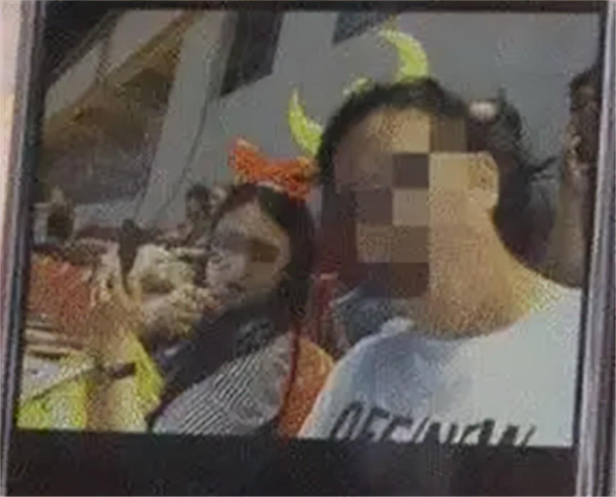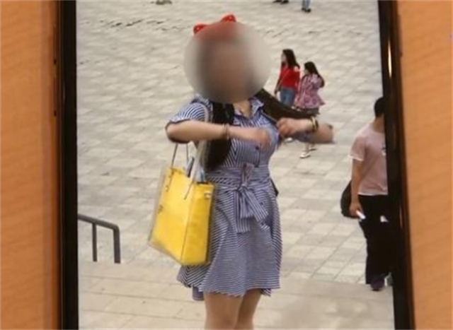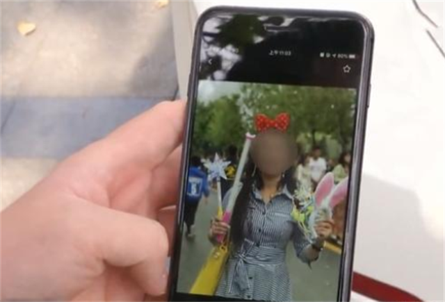 只見照片里的女孩打扮時(shí)尚,身穿藍(lán)白相間的短裙,頭頂扎著紅色的米奇頭飾,肩挎黃色大包。