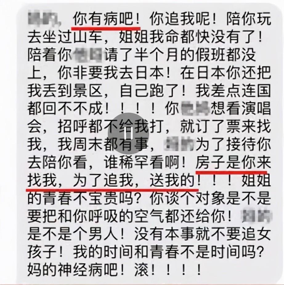 本來就因?yàn)榈貌坏绞謾C(jī)而氣急敗壞的笑笑,這下暴跳如雷,還給李木發(fā)來幾段不堪入目的短信:“你有病吧!是你追我呢,陪你玩過山車,我命都快沒了!房子是你來找我,為了追我,送我的!我讓你來了嗎?姐的青春不寶貴嗎?你是不是個(gè)男人,沒本事就不要追女孩子。你從頭到尾都透漏著惡心、無恥、恐怖!”