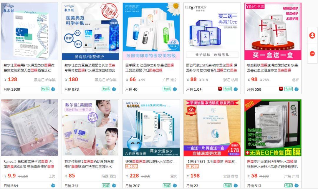 芽芽去淘寶搜了一下,醫(yī)美面膜的市場可以說是魚目混珠了,就拿淘寶首頁的這張圖來說,其實(shí)就混雜著各種打著醫(yī)美旗號的“假面膜”。