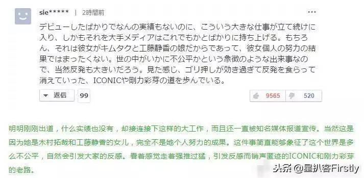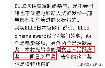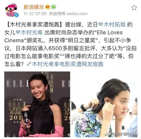 大神的女兒——木村拓哉之女木村光希,因?yàn)樵谌毡緯r(shí)尚雜志舉辦的“Elle Loves Cinema”頒獎(jiǎng)禮上獲得“明日之星獎(jiǎng)”,引起大片爭(zhēng)議