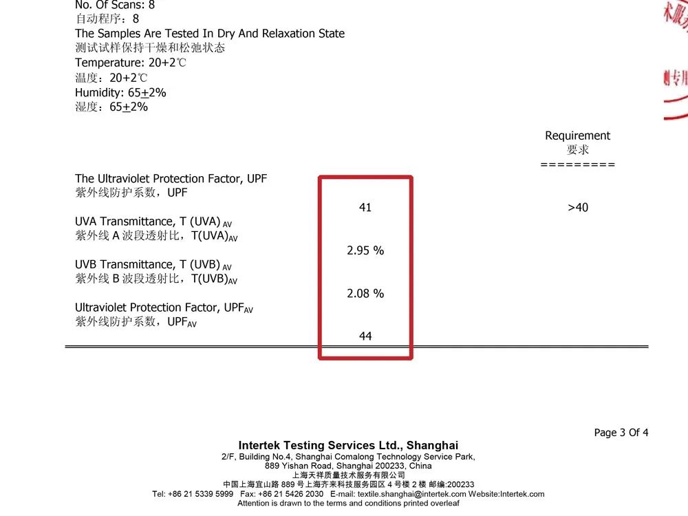 UPF>50,UVA、UVB的透射比都很低,能有抵御紫外線對皮膚的傷害。