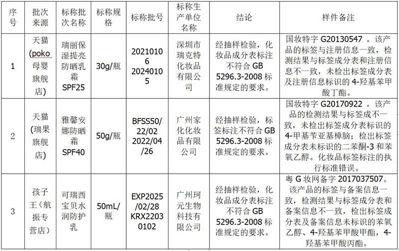 不過,瑞麗保濕提亮防曬乳霜、雅馨安娜防曬霜、可瑞西寶貝水潤防護(hù)乳這3批次樣品,存在不符合相關(guān)要求的現(xiàn)象,具體表現(xiàn)如下: