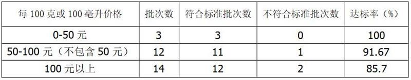 除此之外,在其余的5項(xiàng)檢測中,本次比較試驗(yàn)29批次樣品均符合相關(guān)規(guī)定的要求。值得注意的是,本次試驗(yàn)購買的產(chǎn)品,每100克或毫升的價(jià)格在24.9元至560元不等。不過,經(jīng)檢測發(fā)現(xiàn),每100克或毫升價(jià)格在100元以上批次的達(dá)標(biāo)率,總體低于每100克或毫升中等價(jià)格(50-100元)和低價(jià)(50元以下)的批次達(dá)標(biāo)率。這表明產(chǎn)品的質(zhì)量與價(jià)格并沒有直接關(guān)系,關(guān)鍵在于生產(chǎn)企業(yè)是否嚴(yán)格按照有關(guān)規(guī)定要求進(jìn)行規(guī)范生產(chǎn)。