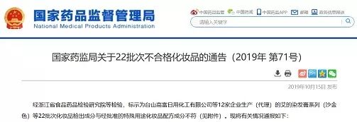 2019年10月15日,藥品監(jiān)督管理局官網(wǎng)發(fā)布通告稱,經(jīng)浙江省食品藥品檢驗研究院等檢驗,標示為臺山高富日用化工有限公司等12家企業(yè)生產(chǎn)(代理)的艾的染發(fā)膏系列(沙金色)等22批次化妝品檢出成分與經(jīng)批準的特殊用途化妝品配方成分不符。