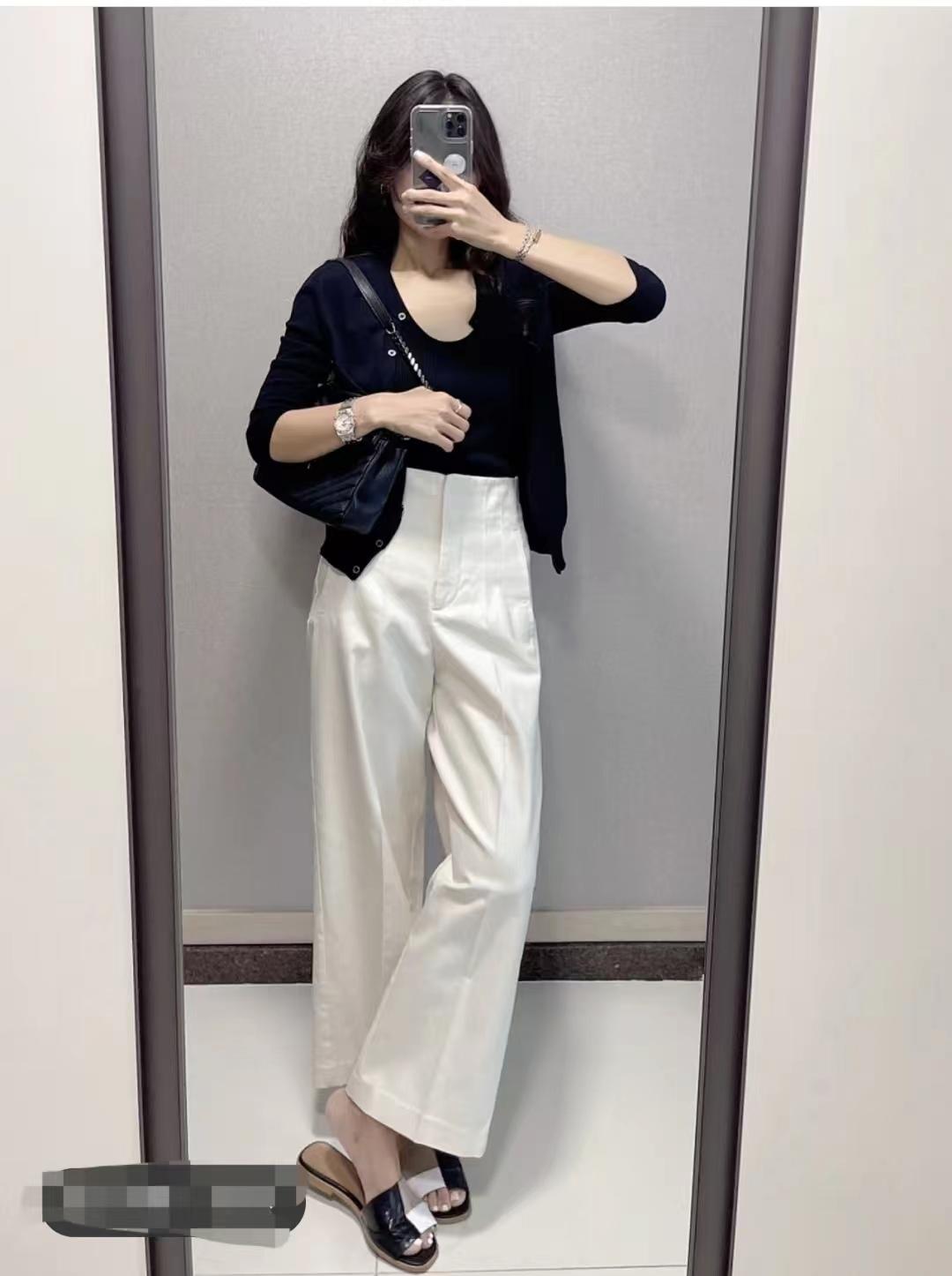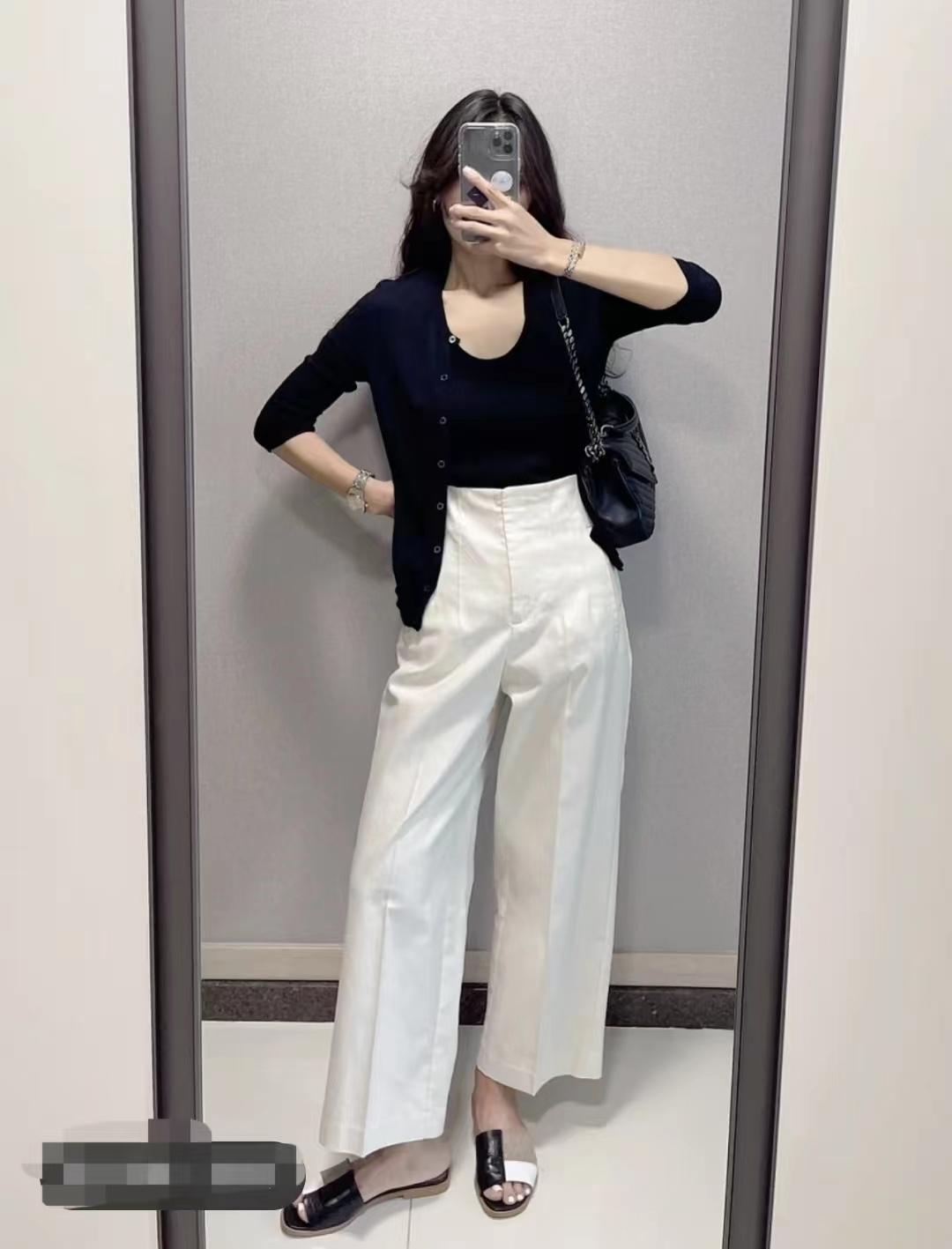 夏季防曬開衫+休閑褲穿搭,內(nèi)里是針織背心打底,一套夏日出行防曬必備單品搭配,下半身搭配米白色高腰休閑褲和瑞典小眾涼拖,打工人簡約大氣通勤穿搭。