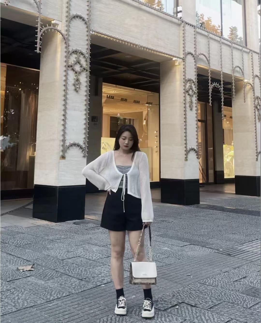 look2 白色防曬小開衫+內(nèi)搭灰色吊帶衫+黑色短褲