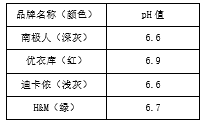 從實(shí)驗(yàn)數(shù)據(jù)中可以看出,四個(gè)品牌防曬服的pH值均符合“pH值在4.0—8.5范圍內(nèi)”的規(guī)定。也就是說,即使是在夏日貼身穿著這些品牌的防曬衣,我們的嬌弱的皮膚也不會受到刺激。