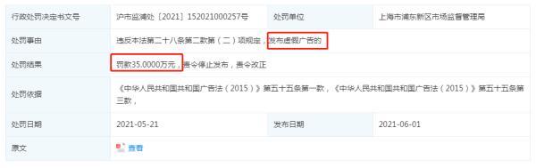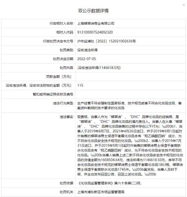 DHC蝶翠詩在2021年6月因“違反廣告法相關(guān)規(guī)定,發(fā)布虛假廣告”被上海市浦東新區(qū)市場監(jiān)督管理局罰款35萬元。