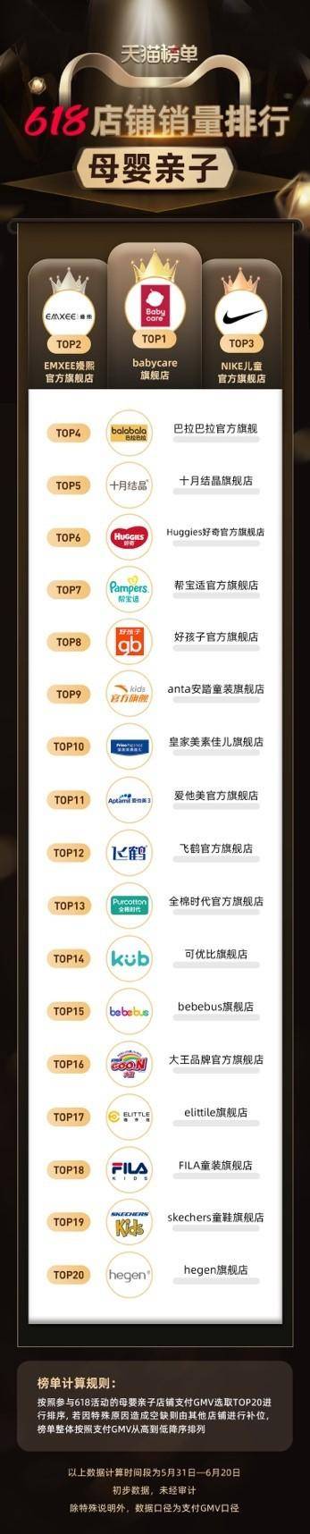 天貓母嬰親子行業(yè)618商家排行榜新出爐,從全周期天貓店鋪成交額來看,Babycare拿下第一,嫚熙、耐克兒童位居二三,巴拉巴拉、十月結(jié)晶、好奇、幫寶適、好孩子、安踏童裝、皇家美素佳兒躋身前十。
