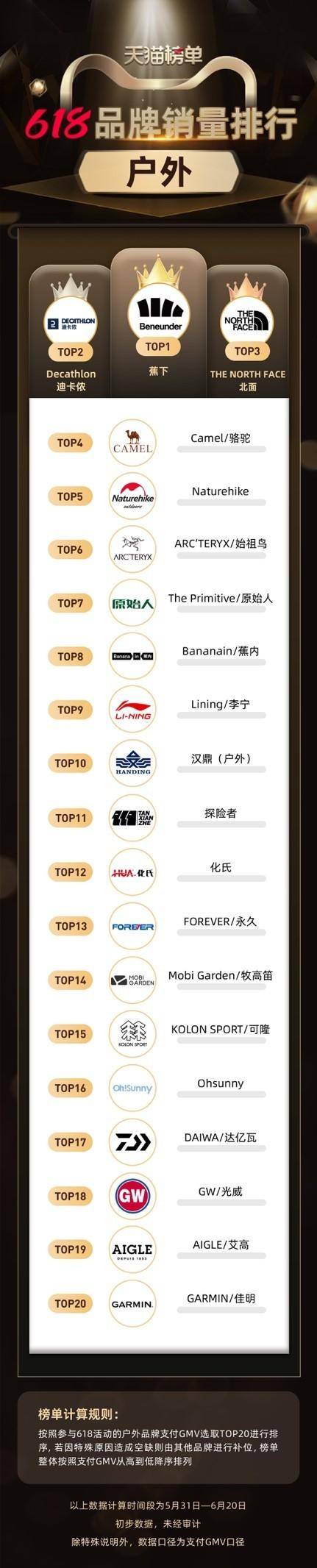 人們對于戶外運動的消費熱情,也帶動了相關(guān)品牌的成交增長顯著。迪卡儂、駱駝、THE NORTH FACE、始祖鳥、探險者、原始人等深耕戶外領(lǐng)域多年的專業(yè)品牌,今年618均取得了較高的同比增長。而像Naturehike、漢鼎等新興的國產(chǎn)戶外品牌,也借助露營、垂釣等新消費風(fēng)口取得突破。