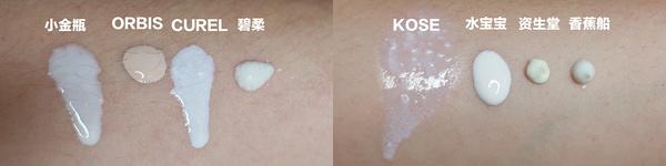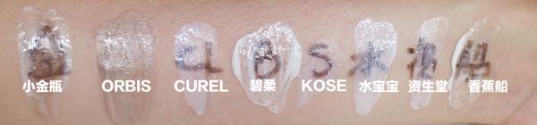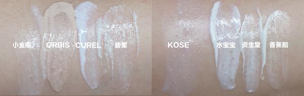 除了ORBIS是粉底色外,其他都呈白色。在手背上推開,看到小金瓶、碧柔、KOSE三者是相對比較輕薄的,水寶寶、CUREL比較滋潤。另外CUREL、碧柔、水寶寶、資生堂都是走溫和線,所以小baby也可以放心用。