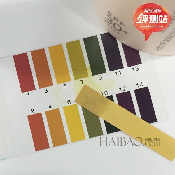 評(píng)測結(jié)果:由圖中可以看出,在涂抹上隔離液后,試紙呈現(xiàn)的顏色顯示其PH值在4—5之間,為弱酸性,與人體臉部肌膚的PH值接近。證明這款隔離液性質(zhì)很溫和,不會(huì)帶來刺激果,敏感肌也能安心使用。
