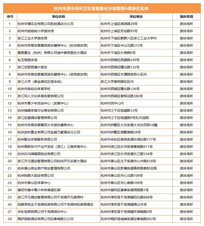 后,杭小微附上新杭州市游泳場所衛(wèi)生監(jiān)督量化分級管理A級單位名單,愛游泳的你收好哦!