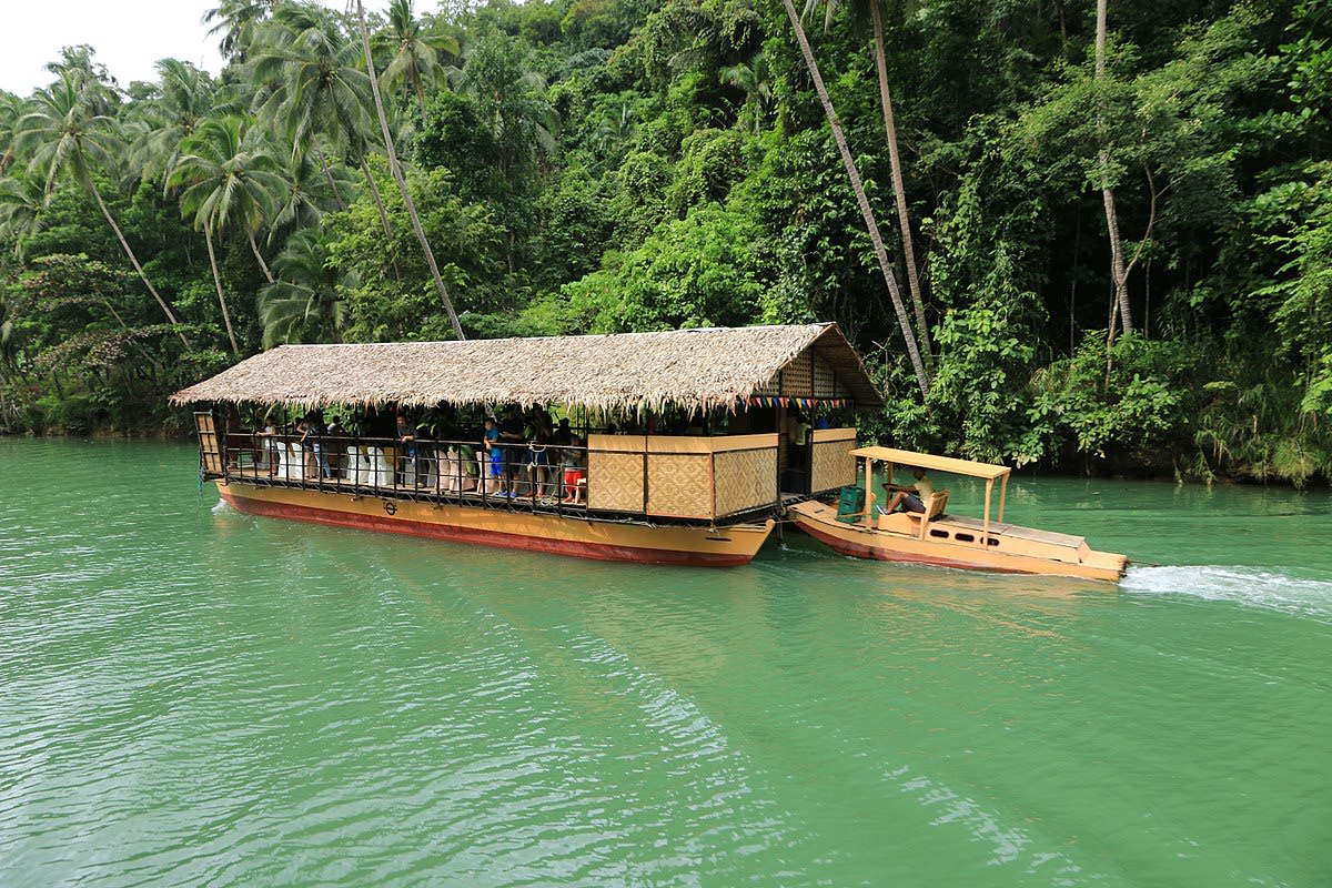搭乘游竹筏編成的小船,在Loboc River上航行,沿途欣賞熱帶叢林風光,船上會提供海鮮自助吧,雖然樣式不算多,但搭配著河景就很有東南亞風味的愜意舒暢感。到達中間一處中繼平臺會有當?shù)鼐用癯?、跳舞供游客欣賞,有時也會邀請游客一同歌舞。