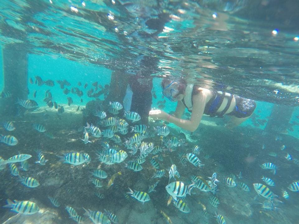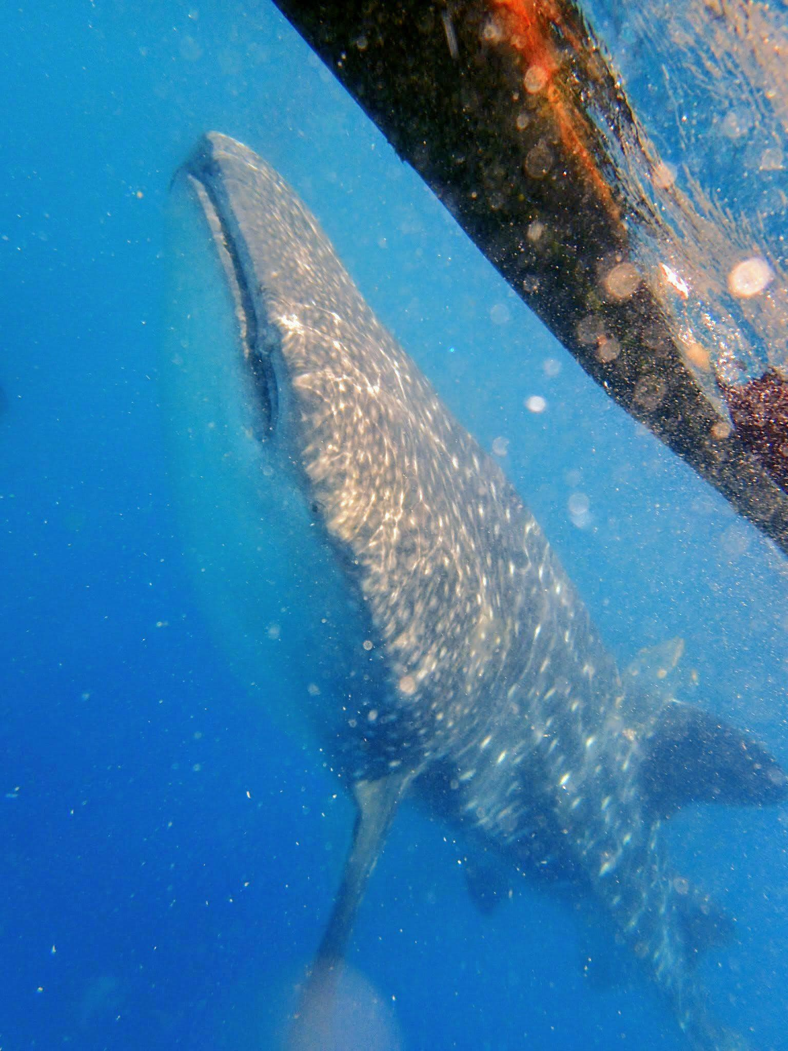從出海和鯨鯊共游的時間大約只有30分鐘到1小時,船夫會灑蝦米引誘鯨鯊游上海面,如果是比較怕的人,船夫也會趁鯨鯊游靠近時,助你一臂之力把你壓進海面,提醒你要記得拍照。