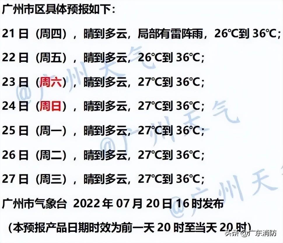 廣州市氣象臺預(yù)測,21日,副熱帶高壓邊緣不穩(wěn)定氣流影響,多云到晴,有分散或局地雷陣雨;22日~29日,副熱帶高壓控制,高溫炎熱持續(xù),高氣溫可能超過37℃。