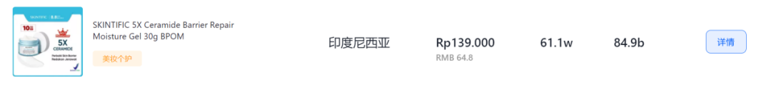 在 TikTok 上,SKINTIFIC 這一款神經(jīng)酰胺屏障修復(fù)保濕面霜 30g 的價(jià)格為 Rp139.000,折算成人民幣約 64.8 元,而同樣主打類似功的 BIOAQUA 面霜 50g 的價(jià)格僅為 Rp49.999,折算成人民幣約 23.3 元。單就這款產(chǎn)品來說,怎么看 SKINTIFIC 價(jià)格都比 BIOAQUA 貴了近 3 倍,但從銷量看,61.1 萬對(duì)比 895,數(shù)量差不是一般的大,不過作為 SKINTIFIC 在 TikTok 的主推產(chǎn)品之一,這款面霜能有如此高的銷量也在情理之中。