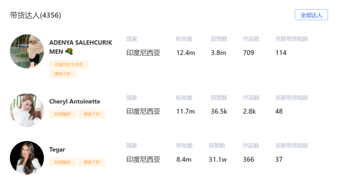 可以看到,在與達(dá)人合作這一塊,SKINTIFIC 顯然是花了功夫的。單就 SKINTIFIC 在 TikTok 印尼小店的情況來看,截止 11 月 2 日,SKINTIFIC 合作的帶貨達(dá)人就有 4356 位,合計(jì)產(chǎn)出視頻 8516 個(gè),在只有 145 個(gè)商品的情況下,這個(gè)產(chǎn)出數(shù)量無疑是巨大的。