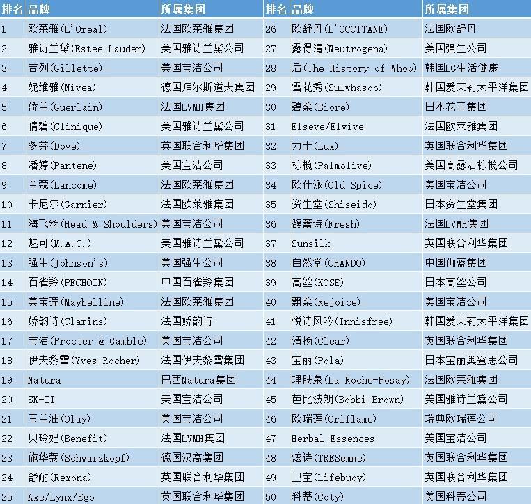 四大日化巨頭之一的美國寶潔公司是上榜品牌數(shù)量多的集團,共計9個,包括潘婷(8)、海飛絲(11)、SK-II(20)、玉蘭油(21)、飄柔(40)等耳熟能詳?shù)钠放?。?lián)合利華集團則有多芬(7)、舒耐(24)、力士(32)、清揚(42)等8個品牌入圍。
