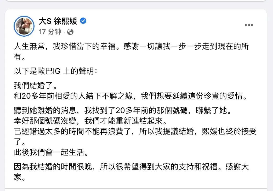 大S也緊隨其后,發(fā)文稱:“人生無常,我珍惜當(dāng)下的幸福,感謝一切讓我一步一步走到現(xiàn)在的所有?!?/span>