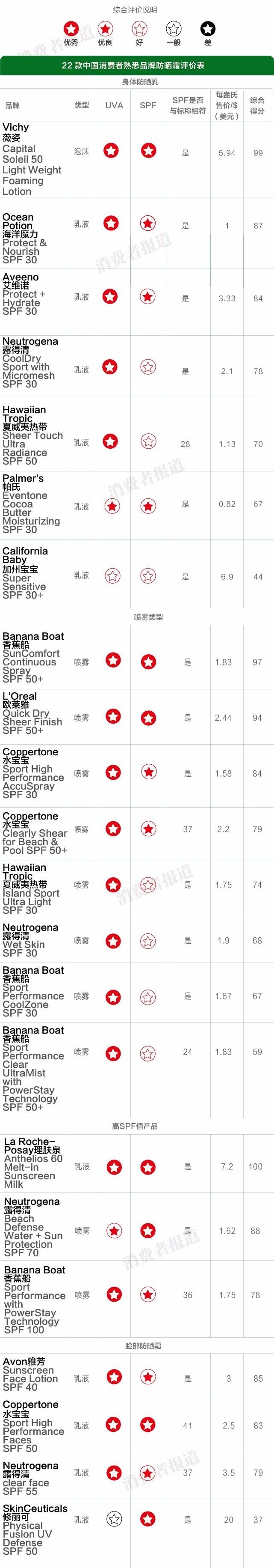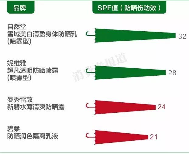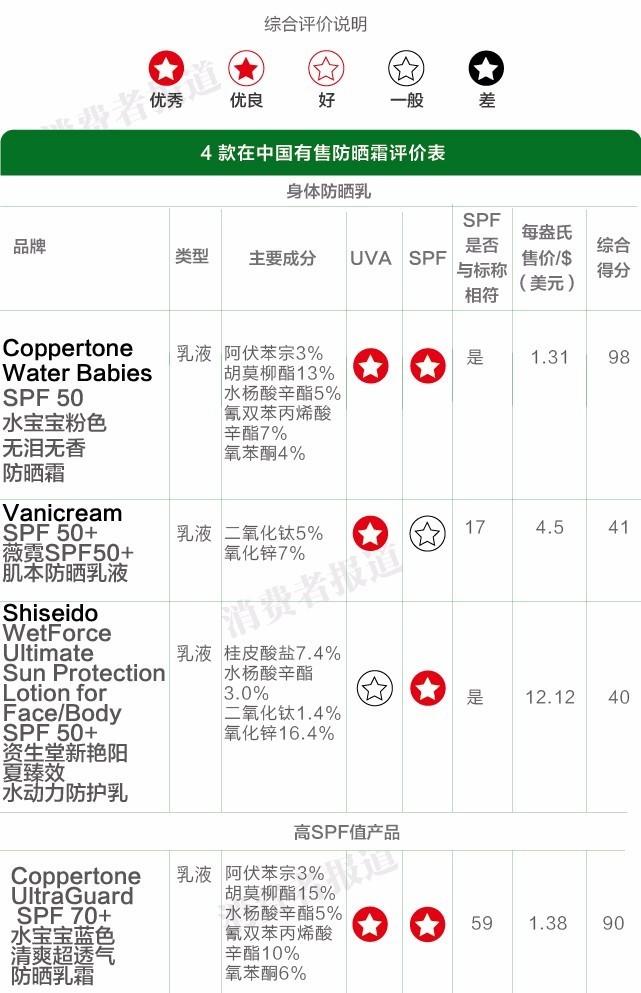 ConsumerReports2015年12月檢測了34款身體防曬霜和6款面部防曬霜的SPF值以及抗UVA紫外線的果。SPF值用于衡量產(chǎn)品抵御UVB紫外線的果,該紫外線能夠?qū)е缕つw灼傷和皮膚癌,UVA紫外線能使皮膚變棕色并加速皮膚衰老,也會增加致皮膚癌風(fēng)險。