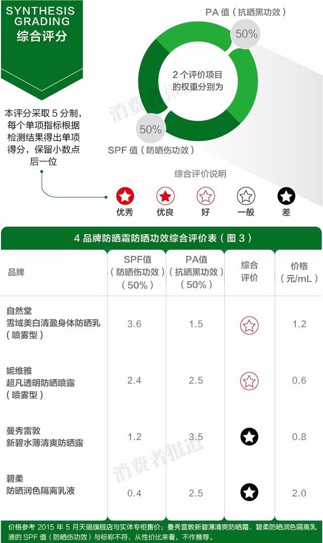 而本刊2015年5月測試的4款防曬霜中,自然堂雪域美白輕盈身體防曬乳與妮維雅超凡透明防曬噴霧的綜合表現(xiàn)較好,其中妮維雅的表現(xiàn)更為均衡。