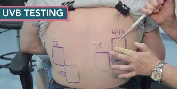為了考察抗UVB防護果,測試員將一定量的防曬霜涂抹到后背六處地方,然后浸泡在浴缸中。這之后,用6個太陽光模擬器發(fā)出的UVB光照射在被涂抹的六處地方,大約1天后,評估被照射處的紅腫情況。