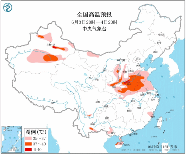 山東省氣象臺于6月3日17時00分繼續(xù)發(fā)布高溫橙色預警信號:今天,魯西北、魯中和魯南地區(qū)已出現(xiàn)35℃以上的高溫天氣。