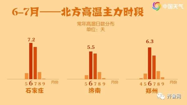 不過,北方的炎熱大多局限于白天,西北地區(qū)東部、華北等地早晚時段都還比較涼爽。從氣候上來看,每年6、7月份是北方一年中高溫集中的時段,濟南、石家莊、鄭州都是6月高溫日數(shù)多,而北京、西安、天津則是7月高溫日數(shù)更勝一籌。