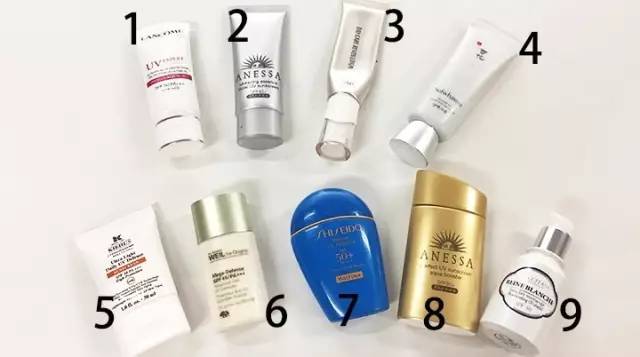 從1至9分別是:蘭蔻柔皙輕透防曬露、安耐曬臉部專用防曬啫喱、怡麗絲爾優(yōu)悅活顏防護精華乳、雪花秀滋晶雪膚美白防護乳霜、科顏氏清爽防曬隔離乳液、悅木之源韋博士卓越防護隔離乳、資生堂新艷陽夏臻水動力防護乳、安耐曬金瓶防曬霜、歐舒丹煥亮防曬乳