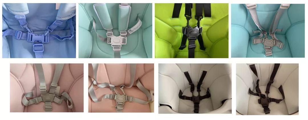 ①8款寶寶餐椅的帶均采用的是5點(diǎn)式設(shè)計,能夠鎖定寶寶的肩部、腰部和襠部,有避免側(cè)翻或下滑。如果寶寶不喜歡太多束縛,也可以切換成3點(diǎn)式。