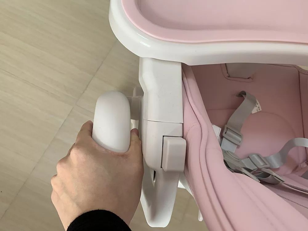 ③貝氏:座椅高度調(diào)節(jié)有些卡頓,餐盤的按鈕比較緊,腳踏/靠背調(diào)節(jié)順滑;帶為一鍵式,打開需稍用力;凈重量6.5kg左右,搬移較輕松,但后腿推行不便。
