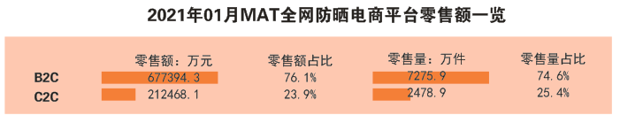 數(shù)據(jù)顯示,本次全網(wǎng)防曬數(shù)據(jù)中,B2C電商平臺占主要市場份額,B2C零售額占比遠(yuǎn)超過C2C。綜合類電商仍是網(wǎng)民們的主要購買陣地,零售額占比92.4%。