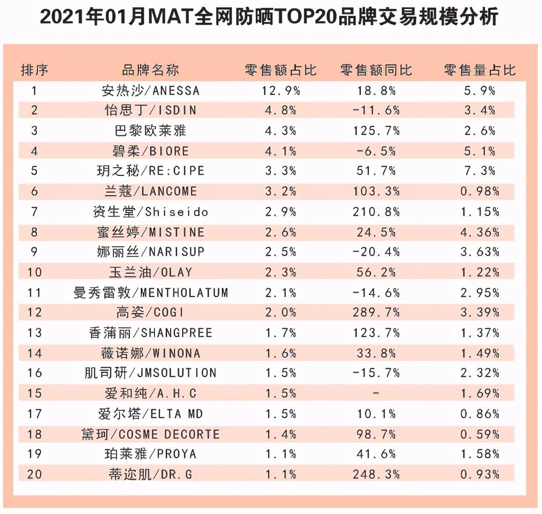 數(shù)據(jù)顯示,進(jìn)口品牌備受追捧,日本品牌安熱沙以12.9%零售額占比奪冠,同比增長18.8%。國產(chǎn)品牌高姿表現(xiàn)出彩,同比增長289.7%。在2021年01月MAT(2020年2月-2021年1月)滾動年期年,怡思丁、碧柔、娜麗絲、肌司研分別呈不同比例的下滑。雖然2020年,人們外出幾乎都佩戴口罩,但整體上防曬需求不減。過去一年,有不少品牌的防曬產(chǎn)品同比增幅達(dá)到三位數(shù),如巴黎歐萊雅、蘭蔻、資生堂、高姿、香蒲麗、蒂邇肌。