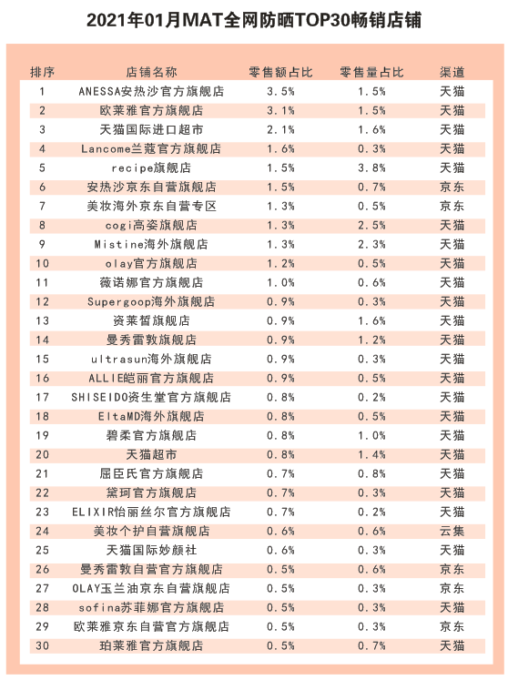 數(shù)示顯示,全網(wǎng)防曬TOP30防曬暢銷店鋪中,天貓占24席,京東和云集分別占5和1席。國產(chǎn)品牌旗艦店占4席,前十名中,國產(chǎn)品牌僅高姿旗艦店入圍,獲第8名。薇諾娜官方旗艦店位列第11名。從外資品牌來看,日系、歐美品牌備受追捧,如安熱沙、巴黎歐萊雅、蘭蔻天貓官方旗艦店。