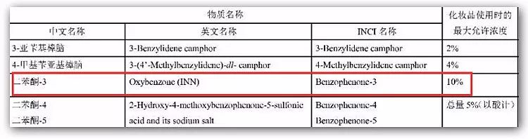我國化妝品使用二苯酮-3時的大允許濃度為10%。