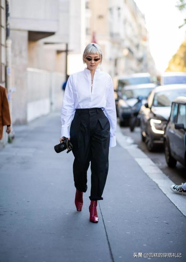純白色系的襯衫穿法基礎,比較適合小白入門搭配。但楊冪帶火的造型,更適合時髦精們造作。