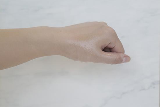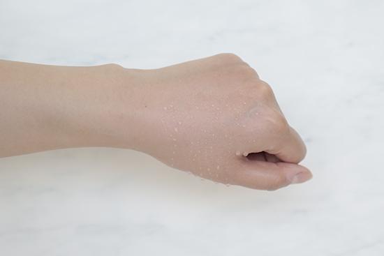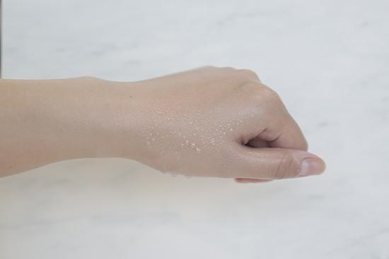 (將產(chǎn)品涂抹在手背上至吸收,再?lài)娚系攘康乃?,凝結(jié)的水珠越多證明防水度越好。)