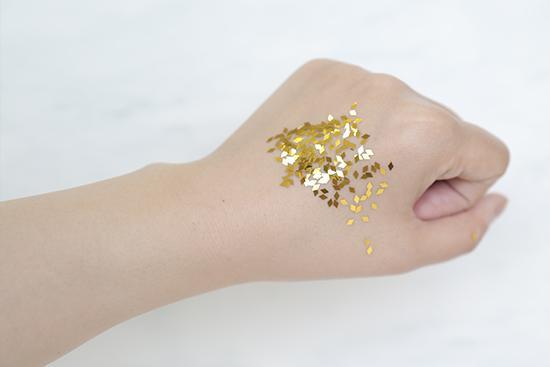 (將產(chǎn)品涂抹在手背上至吸收,再撒上相同數(shù)量的彩色亮片,用力甩手后,殘留越少證明產(chǎn)品越清爽。)