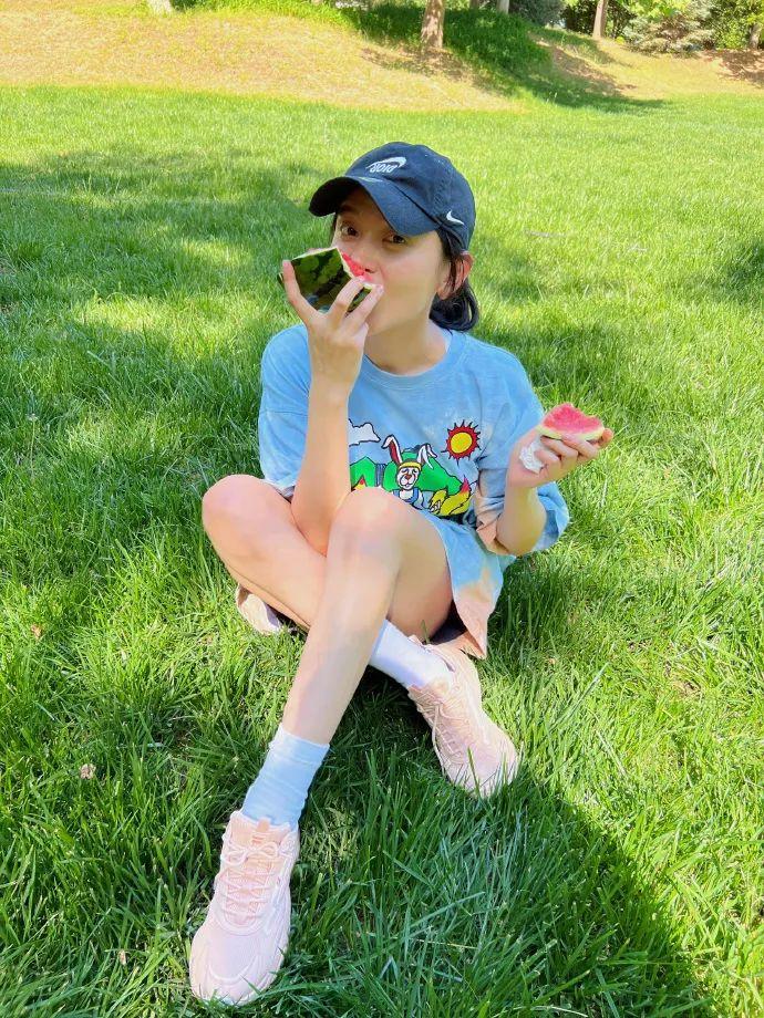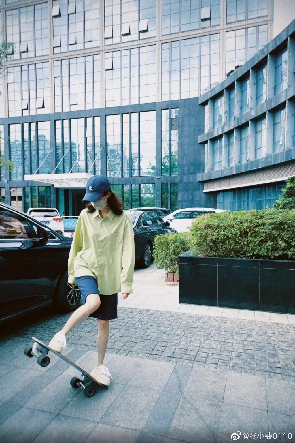 張小斐曬出玩滑板的照片,身穿熒光綠襯衫頭戴棒球帽的她姿勢帥氣,少年感爆棚!