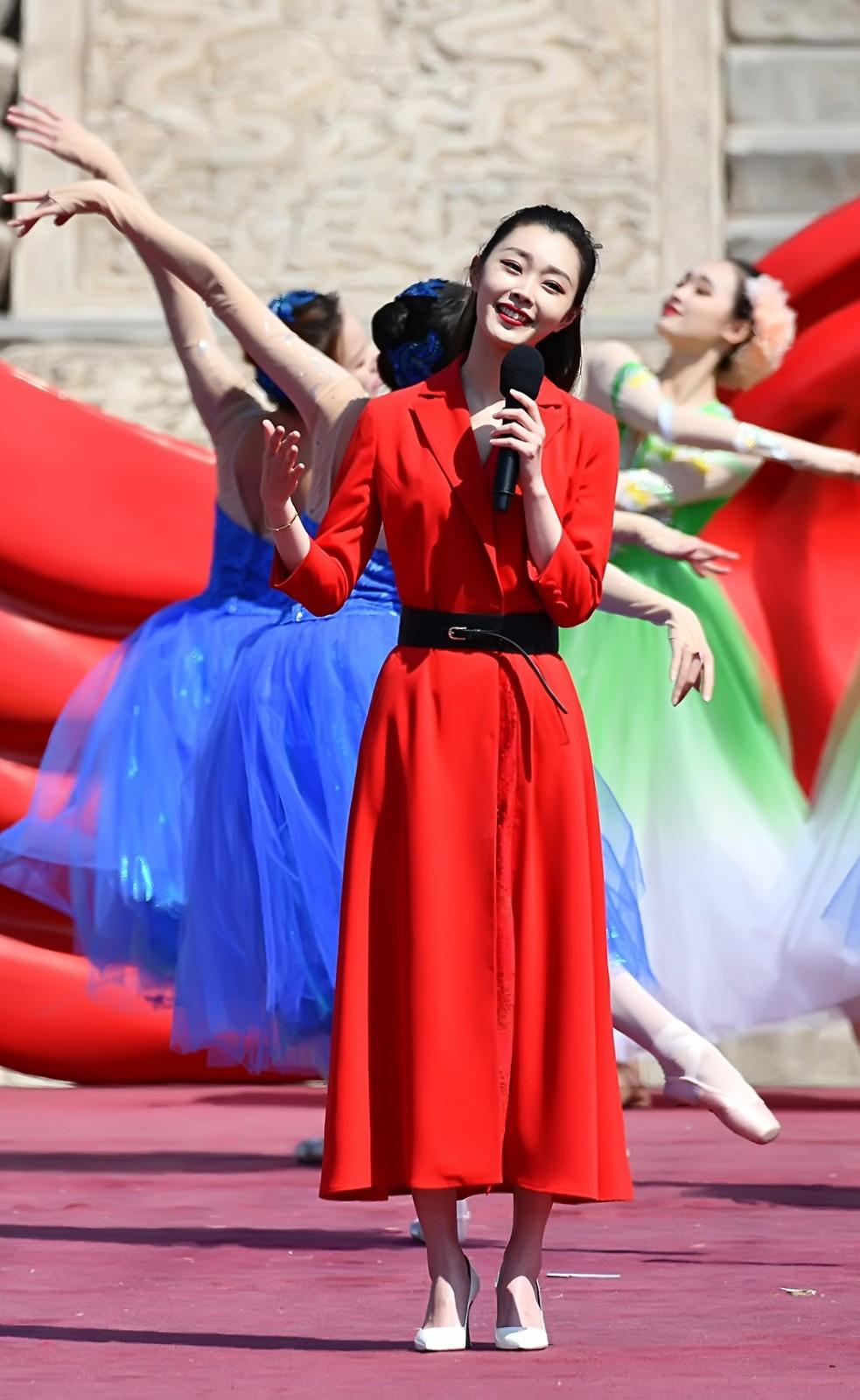 穿上大紅色連衣裙的宋軼,明艷動(dòng)人,西裝領(lǐng)子的設(shè)計(jì),簡單大氣,系上一條黑色腰帶,紅黑撞色的穿搭,既摩登又充滿時(shí)尚感,隨便一站,美成時(shí)尚畫報(bào)。