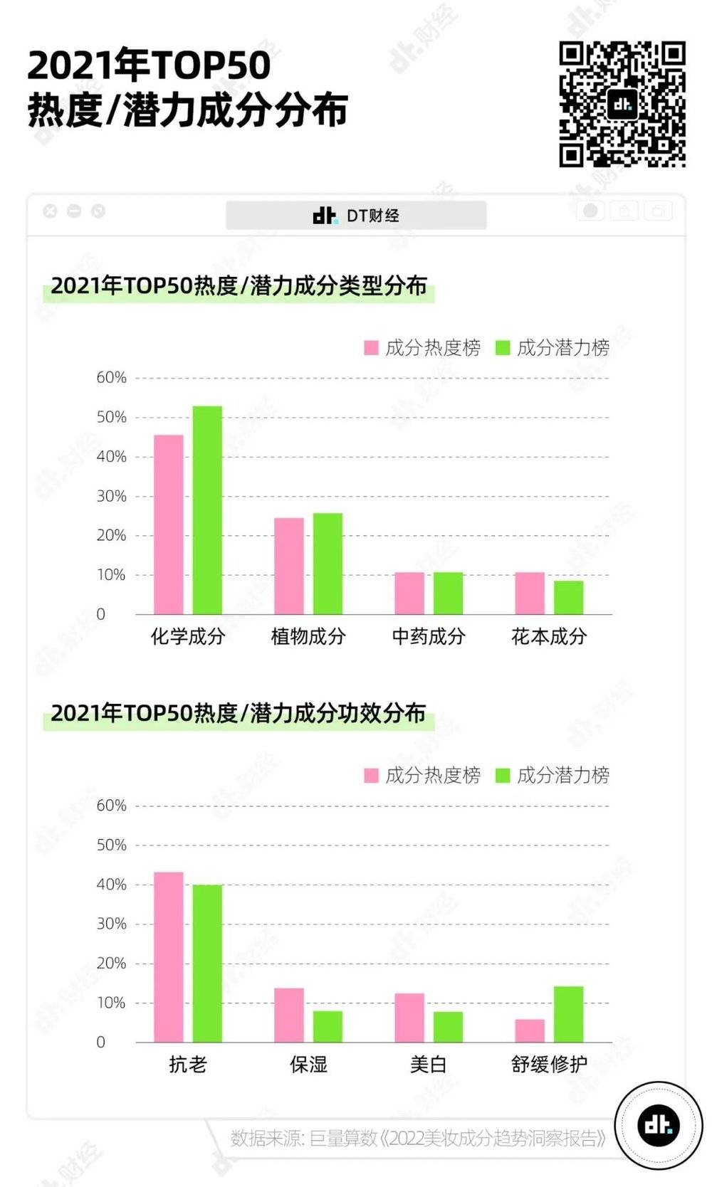 根據(jù)抖音和益普索數(shù)據(jù),2021年熱門和有潛力的成分,主要分為化學、植物、中藥和花本四大類,功則主要集中在抗老、保濕、美白和舒緩修護上。