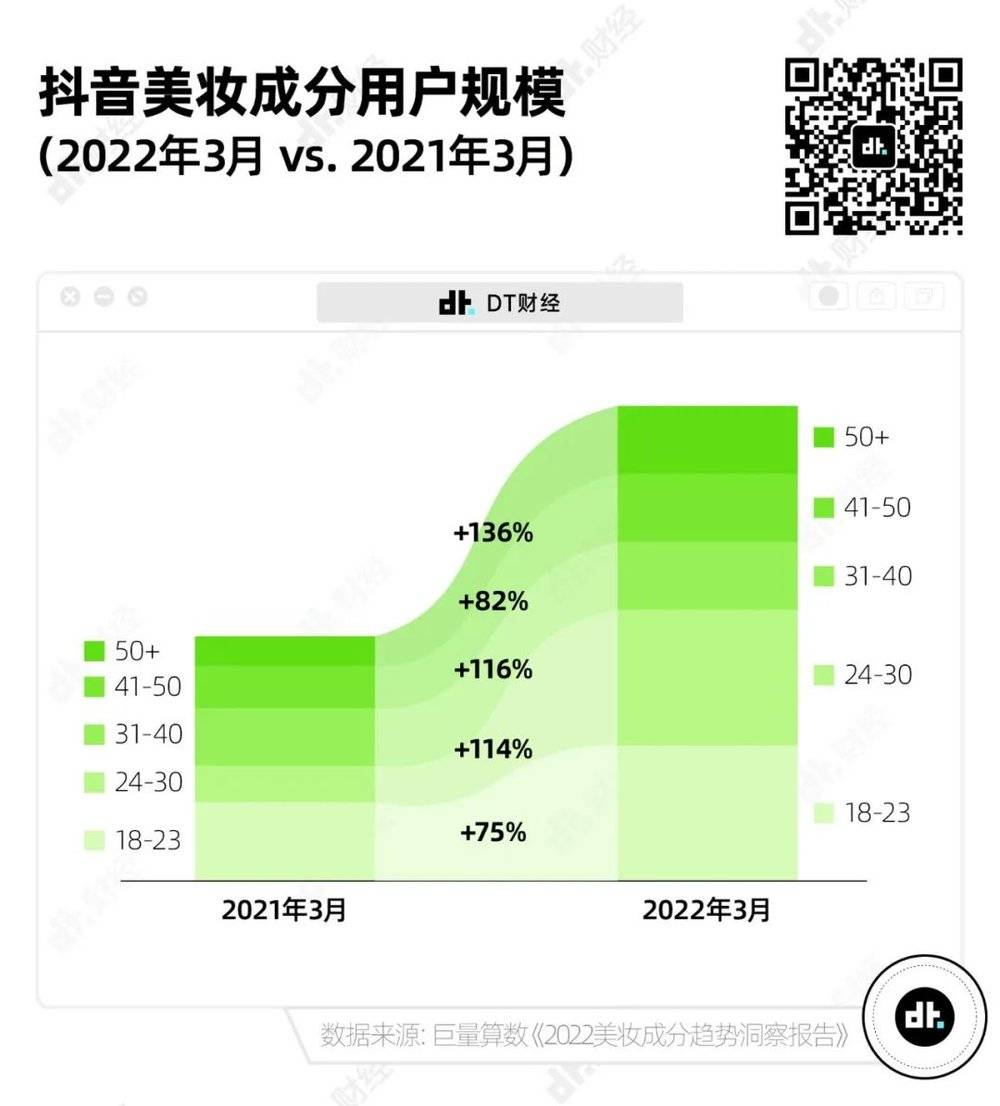 而在抖音上,18~23歲的美妝成分用戶亦占據(jù)比較高的比例,超過24~30歲的前輩,甚至與31~40歲差不多。