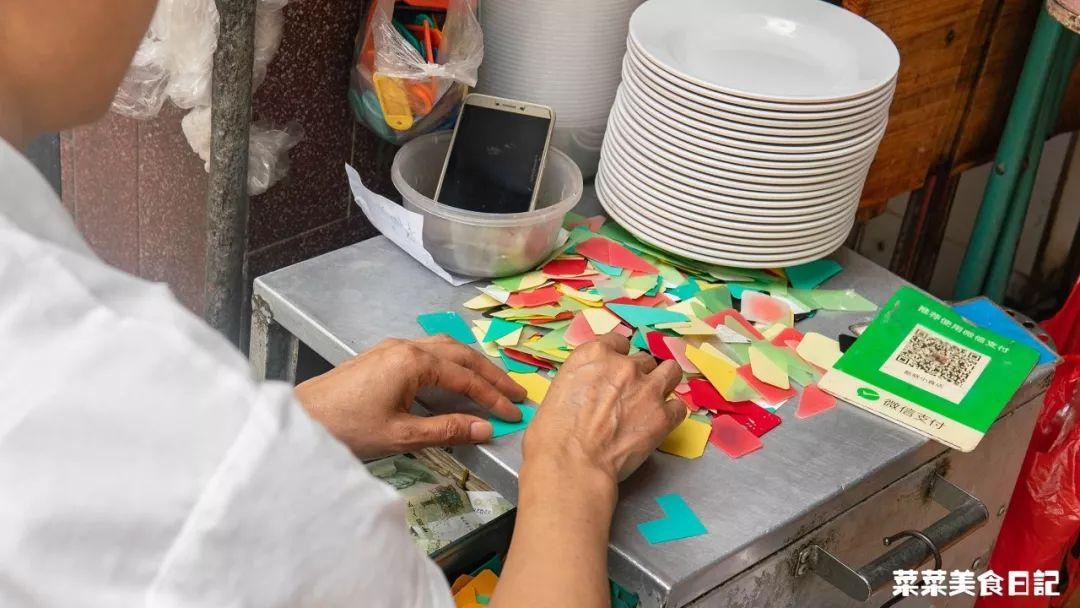 老店不存在小票,還在用著彩色的幾何小卡片溝通收銀與廚房。盡管吃了這么多年,我也還沒搞懂每塊小牌子代表什么。
