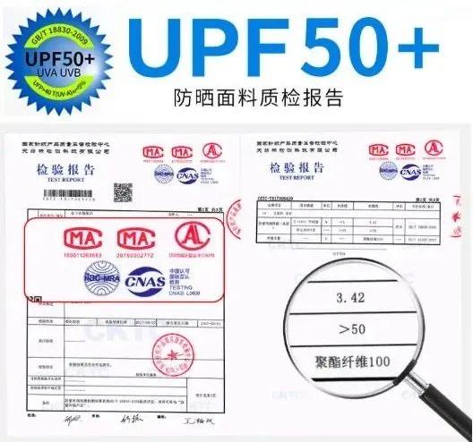 UPF,即紫外線防護(hù)系數(shù),越大越好。UPF40+ 指的是透過(guò)紡織織物的紫外線比值未超過(guò) 1/40 ;UPF50+ 指比值不超 1/50。