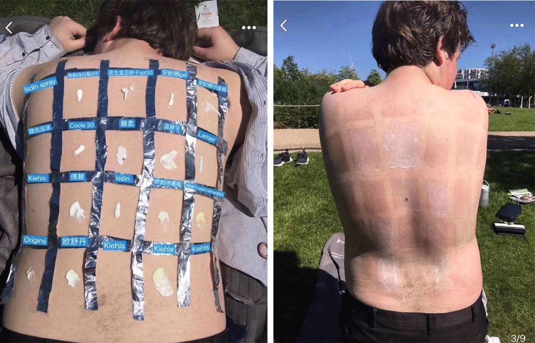 看看下圖這個(gè)做防曬測(cè)評(píng)的硬核小哥,在自己背上涂了15款防曬霜,再到太陽(yáng)下山。