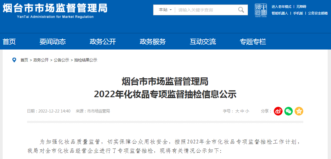 中國質(zhì)量新聞網(wǎng)訊 近日,山東省煙臺市市場監(jiān)督管理局發(fā)布2022年化妝品專項(xiàng)監(jiān)督抽檢信息公示。